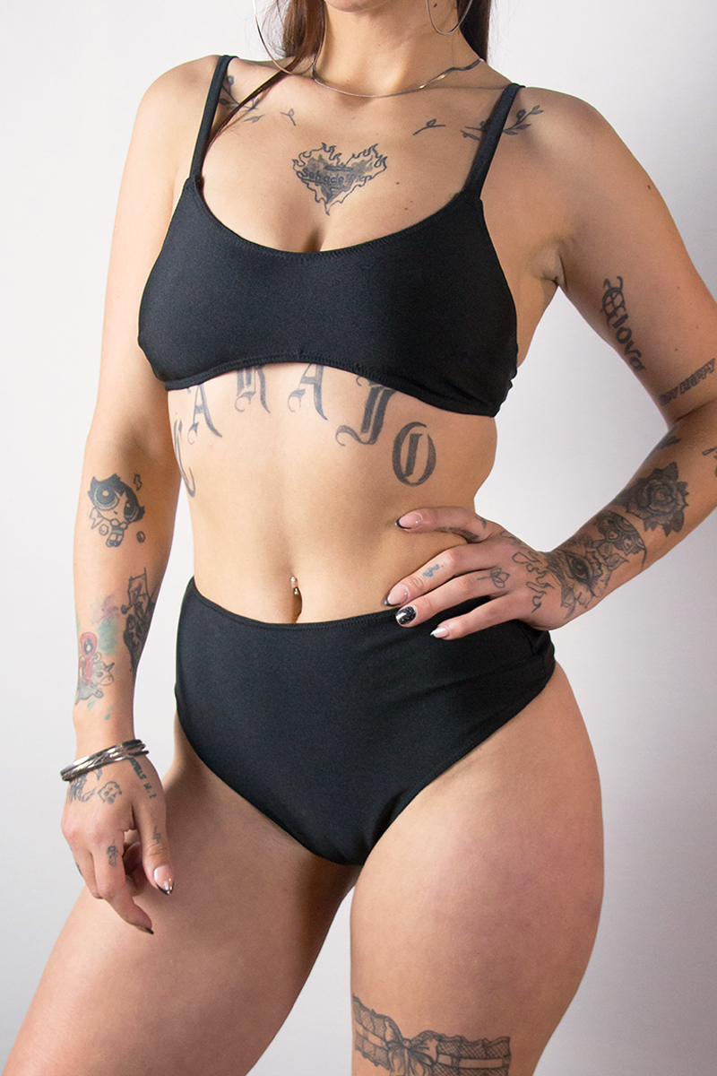 Parte de abajo tipo trusa, de cintura alta, costados anchos y trasera semi-colaless